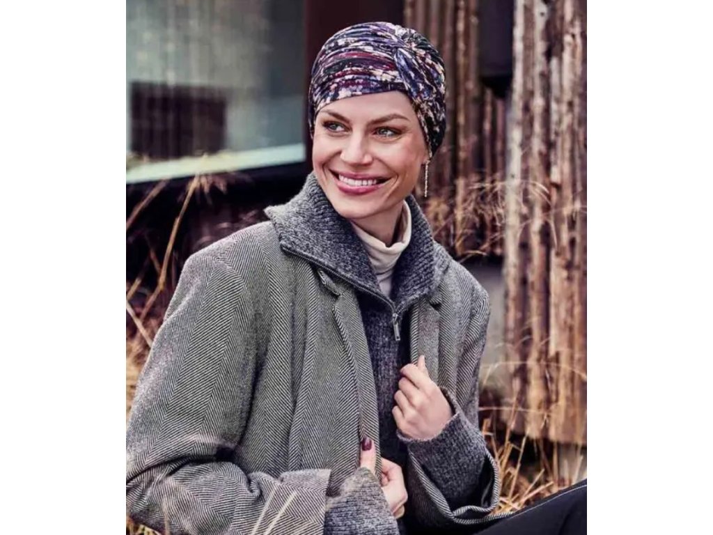 Turban Joyo je nový model se speciálním střihem, který kombinuje eleganci a funkčnost. Model má jednoduchý, přiléhavý základní tvar s mnoha malými záhyby, které jsou navrženy tak, aby pěkně a pohodlně seděly. Přední část zdobí zakroucená, napevno přichycená čelenka, která dodává dokonalý objem kolem čela a vytváří jemný tvar do V těsně nad jedním obočím.